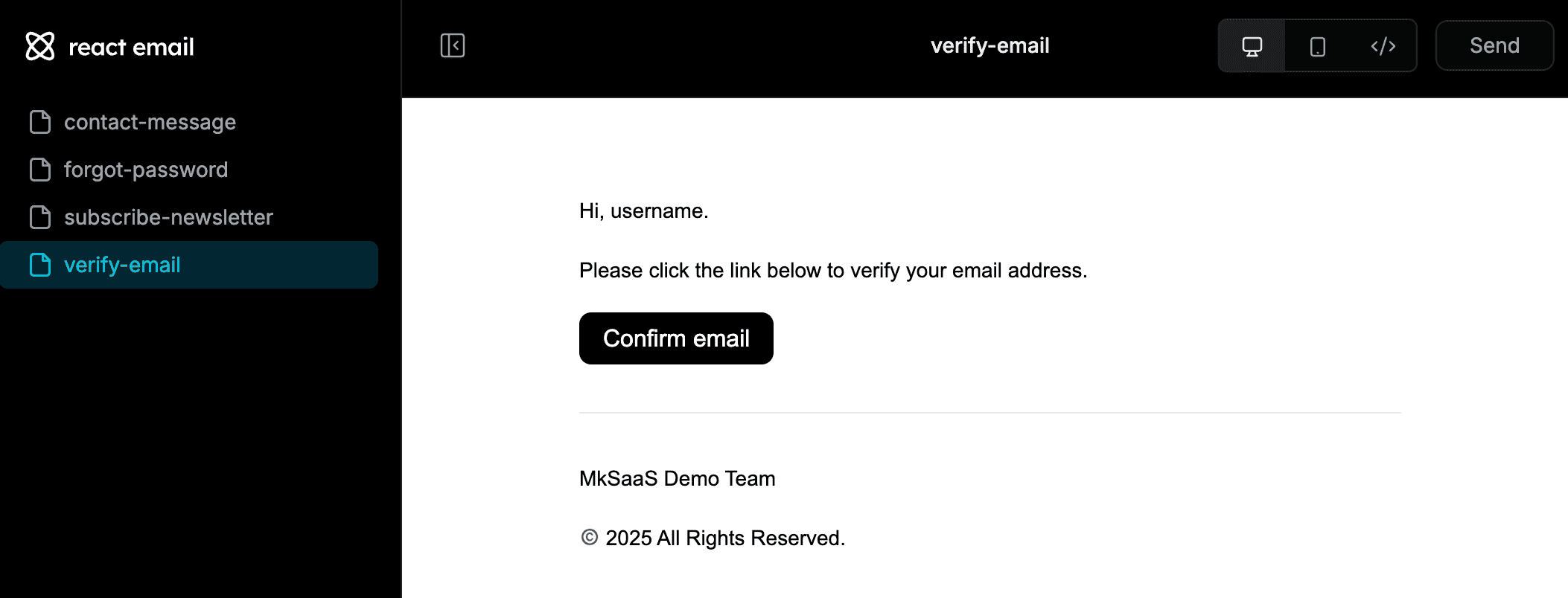 pnpm run emailThis will start a local server that will allow you to preview the emails in your browser.