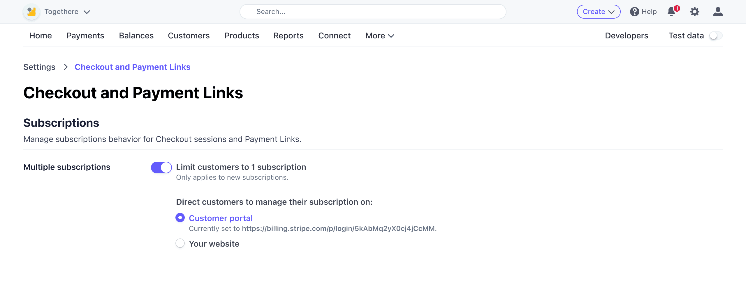 You can enable Limit customers to 1 subscription in the Stripe Dashboard > Settings > Checkout and Payment Links > Subscriptions. You can find more information about Limit customers to one subscription in the Stripe documentation.